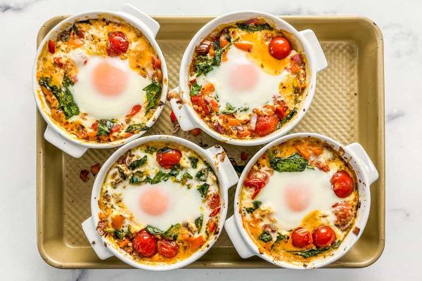 - Pour in egg mixture into prepared pan and bake for 45-55 minutes. Cook time will vary depending on the shape of your baking dish. Allow more time for deep dishes. Cover the top with foil if it starts getting more brown that you prefer.
